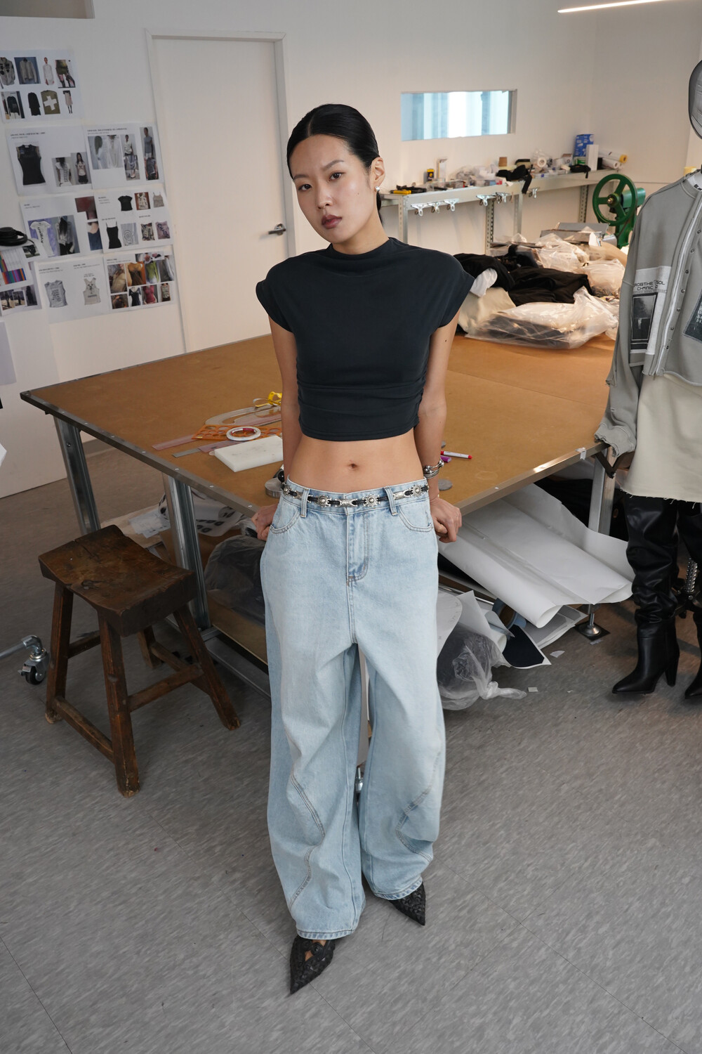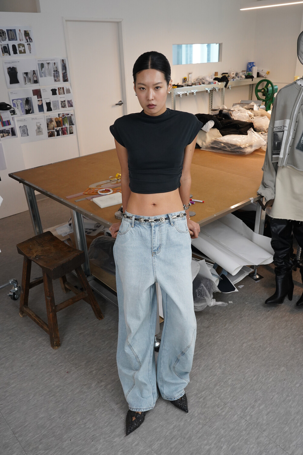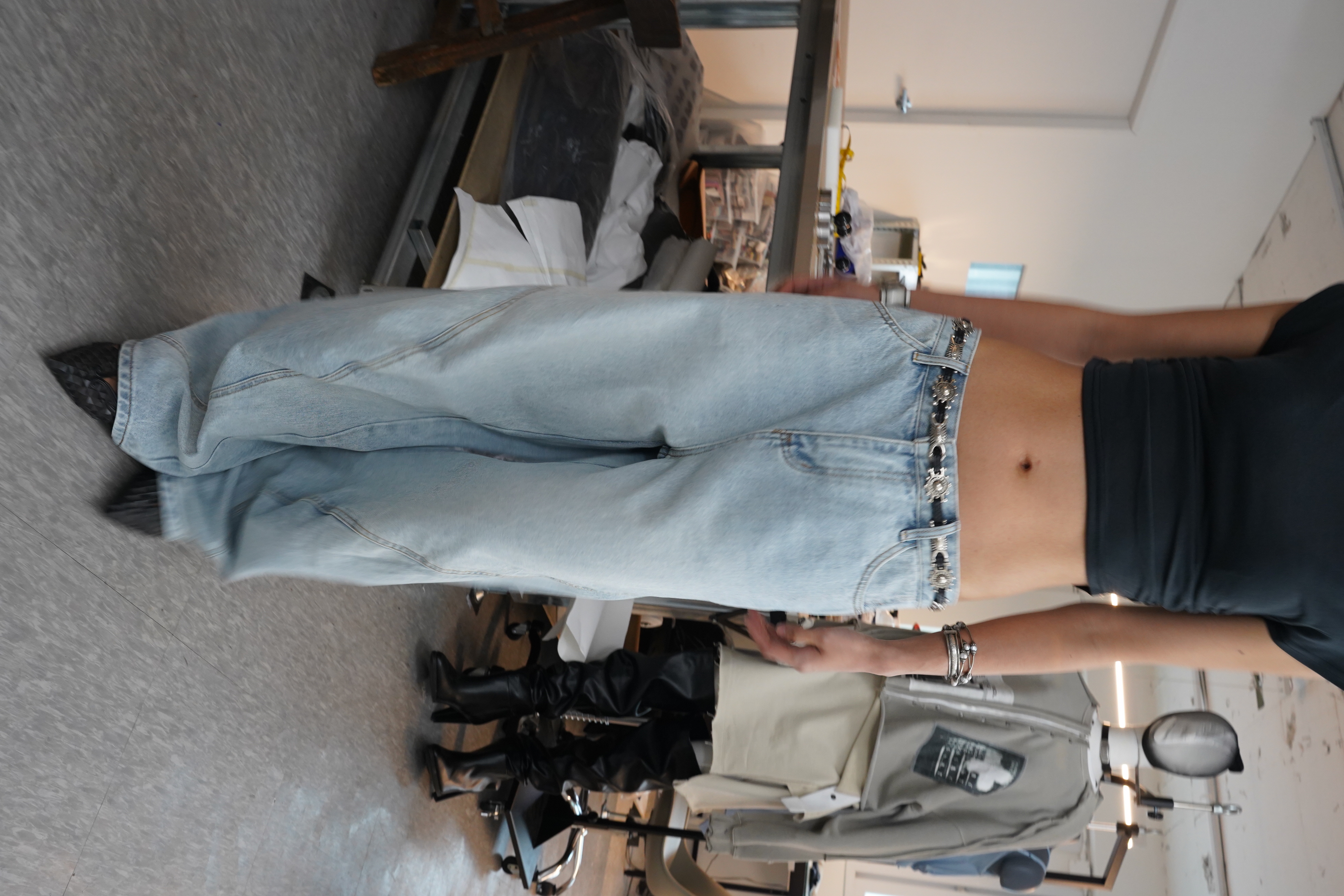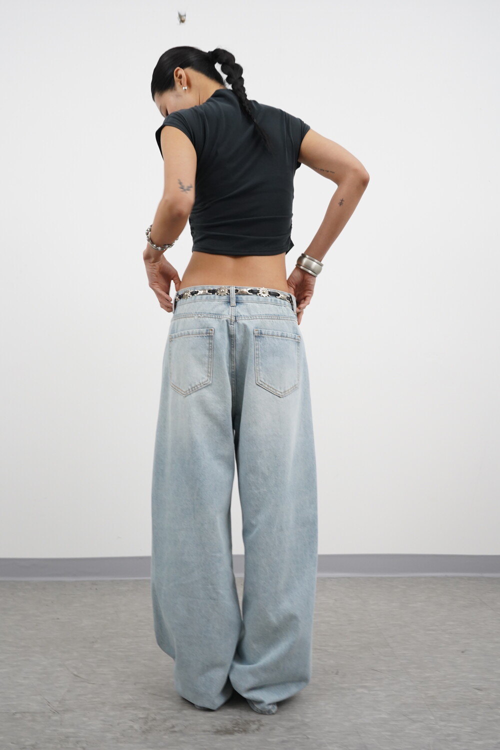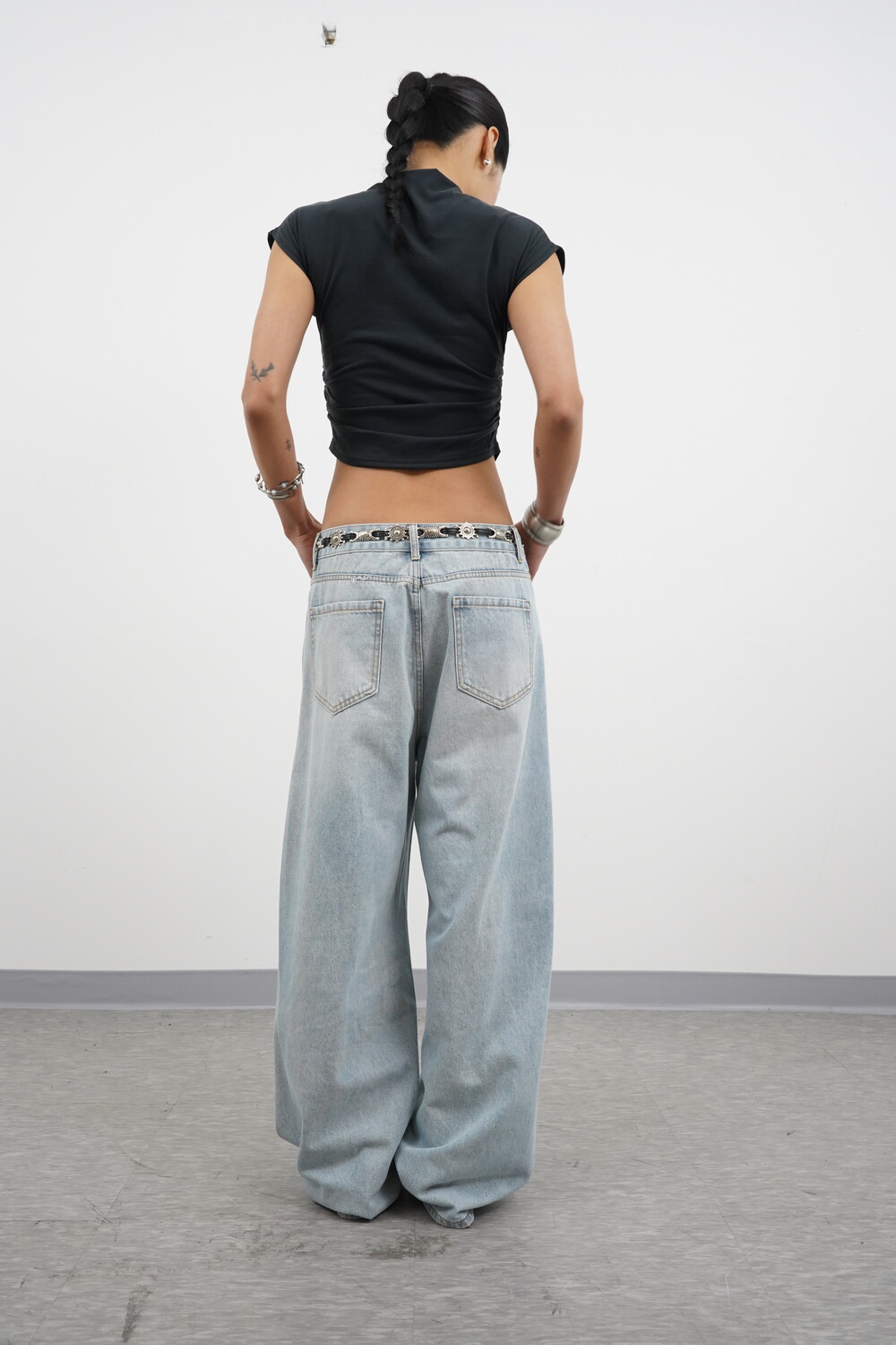 볼륨감 있는 실루엣이 특징인 데님팬츠입니다.
