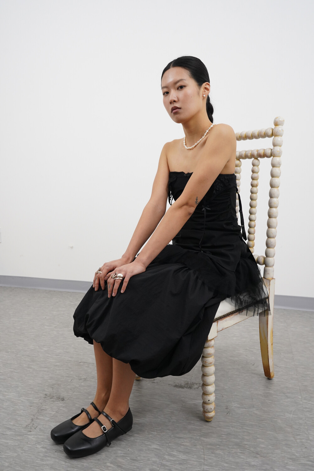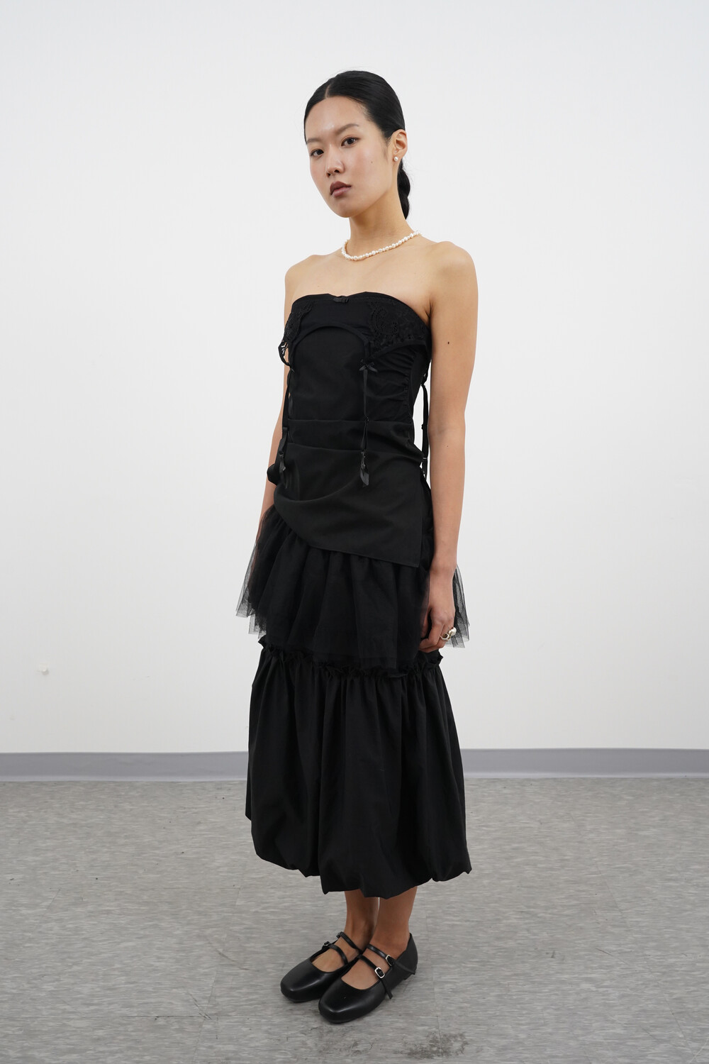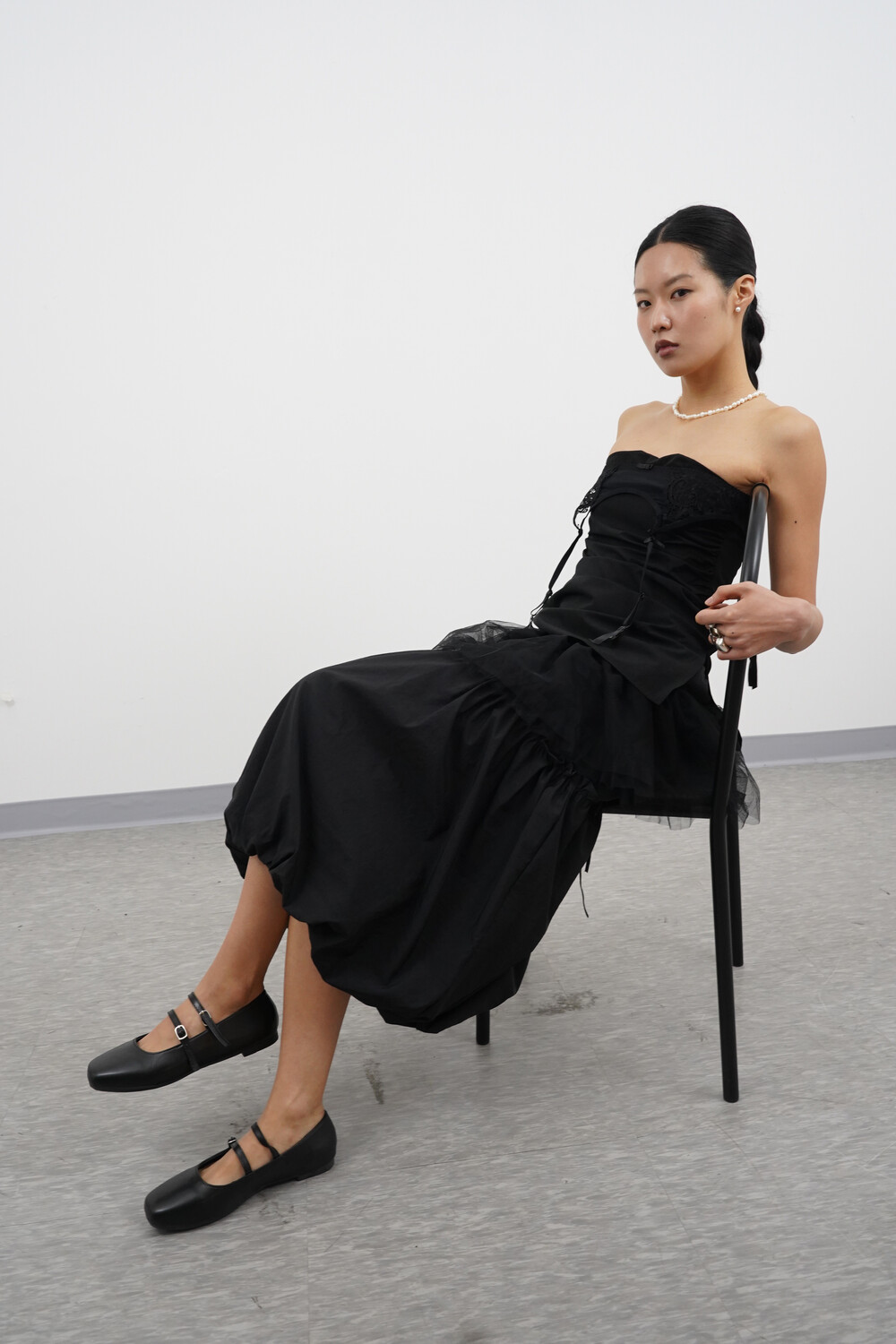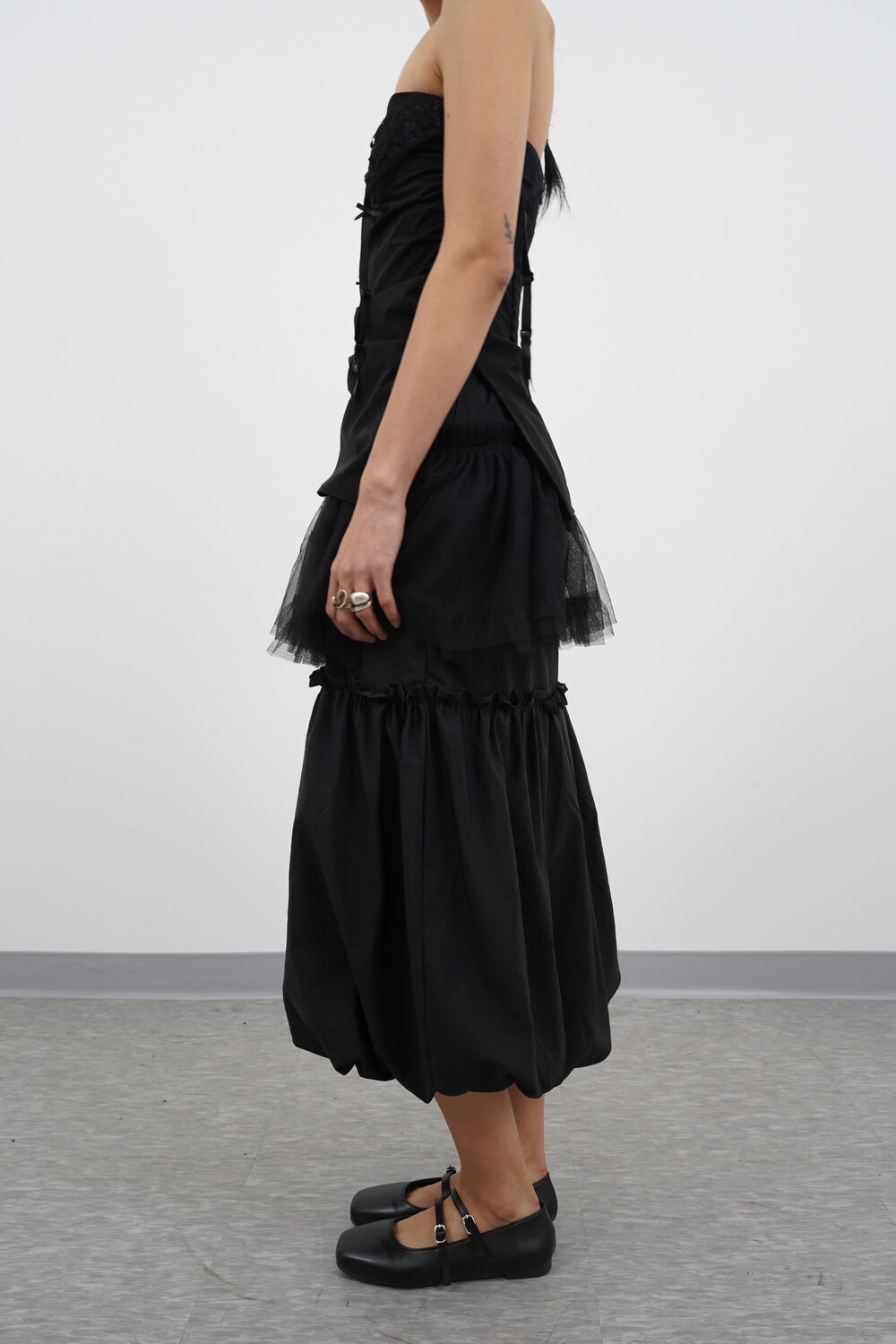 아래로는 셔링을 통해 볼륨 있는 벌룬 실루엣이 연출됩니다.