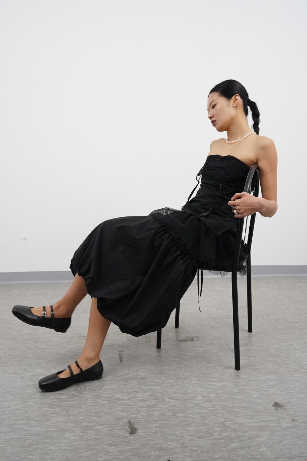 허벅지 라인 절개선에 프릴 디테일이 더해져 장식적인 요소를 주며,